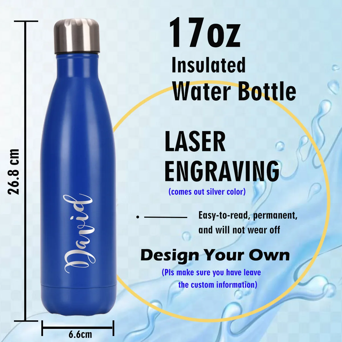 • ✔ Totalmente personalizable: nuestra botella de agua puede agregar su nombre, logotipo o diseño favorito con grabado láser que no se desvanecerá ni se pelará.